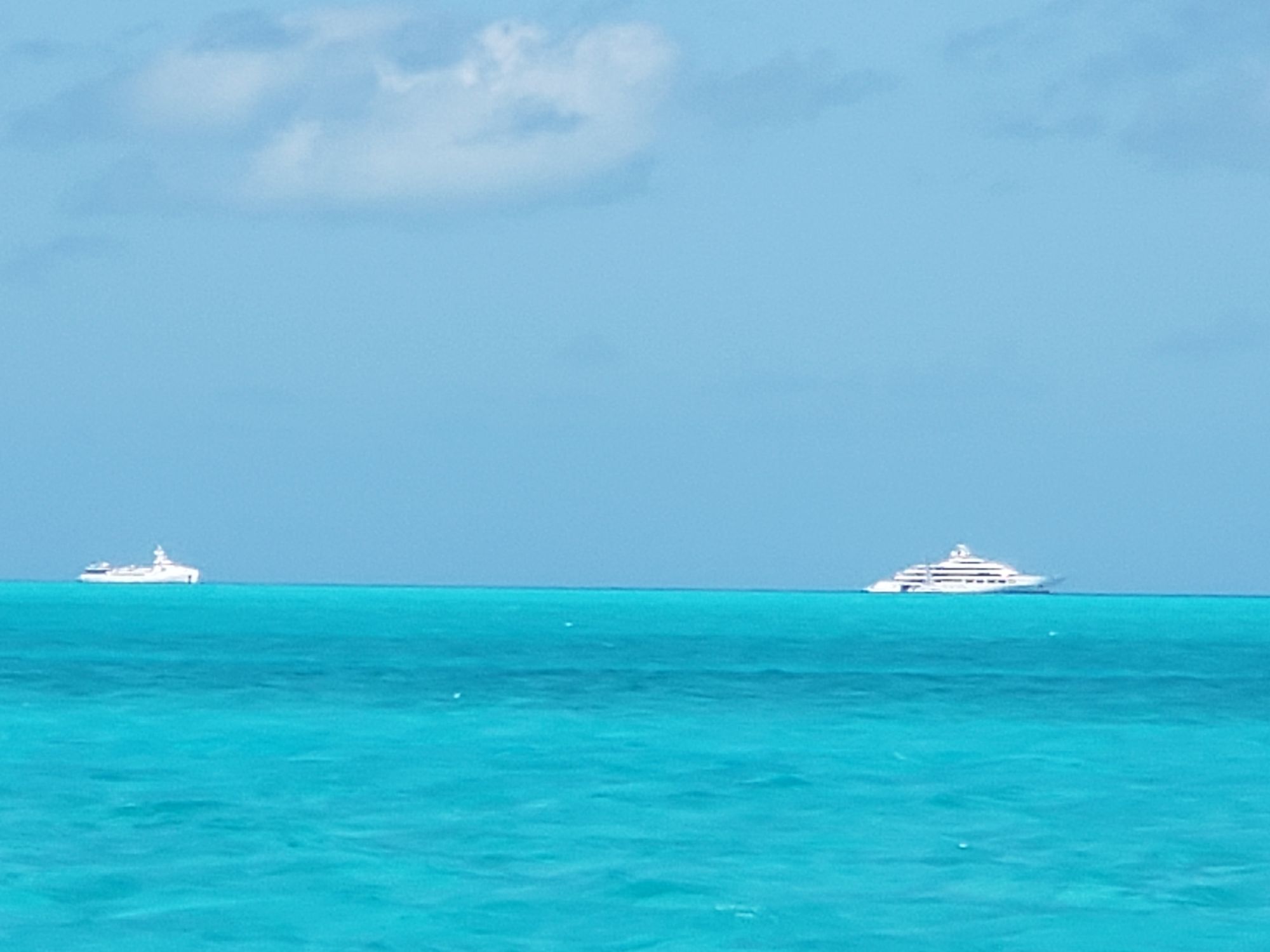 We watched this mega yacht depart ("Infinity"). It's 384 feet long. The "smaller" boat behind ("Intrepid") is its tender. It is only 226 feet long. It has a helicopter on board.
