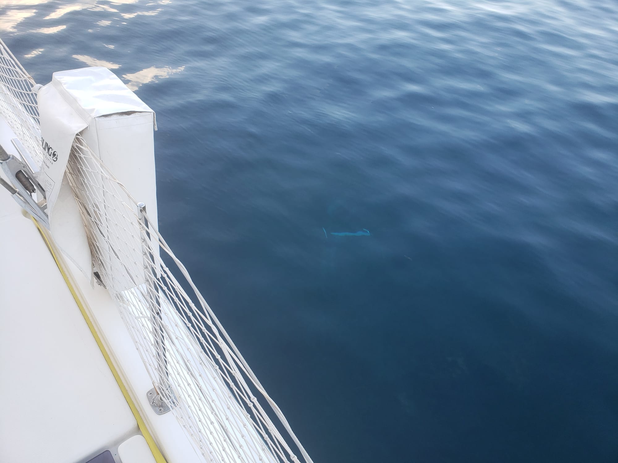 We got an early-ish start and made our way south. The winds were light and variable right off, but once we cleared the island we were greeted with brisk winds with an apparent wind angle of 50-60 degrees. Perfect for sailing! We were doing 7-8 knots for quite a while. And the sea state wasn't nearly as bad as forecasted!