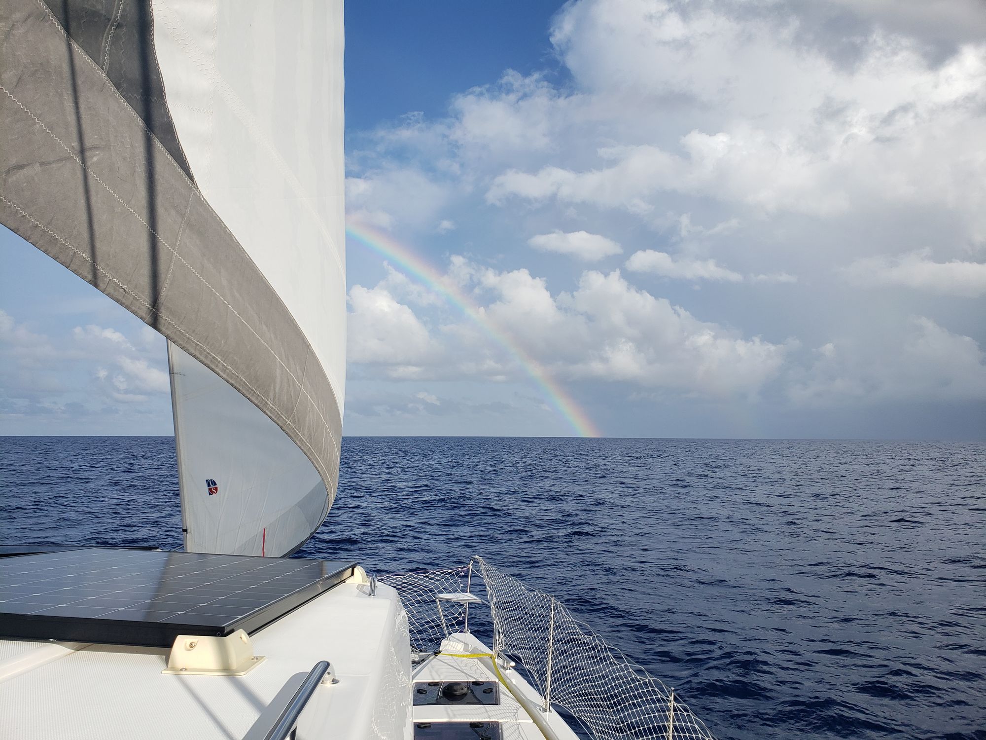 Now, the winds have picked up and we are sailing, doing 7+ knots. The sea state is rougher, but not too bad. We are dodging storms, and had a beautiful rainbow.