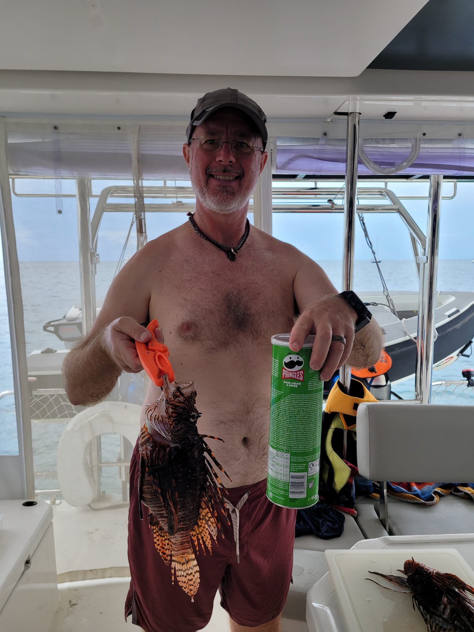 I shot 4, but 2 got away. Hopefully I got the other 2 well enough that they die and get eaten by little fish. The number of lionfish that should be here is zero - and there is a concerted effort by many governments to eradicate them through responsible hunting. Grenada is one of the countries where you can hunt them any time of year, and in any location using any gear you want, including scuba and spear guns. Today we were snorkeling and used pole spears.
