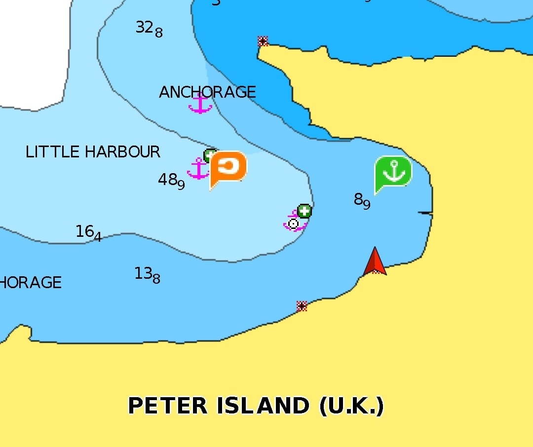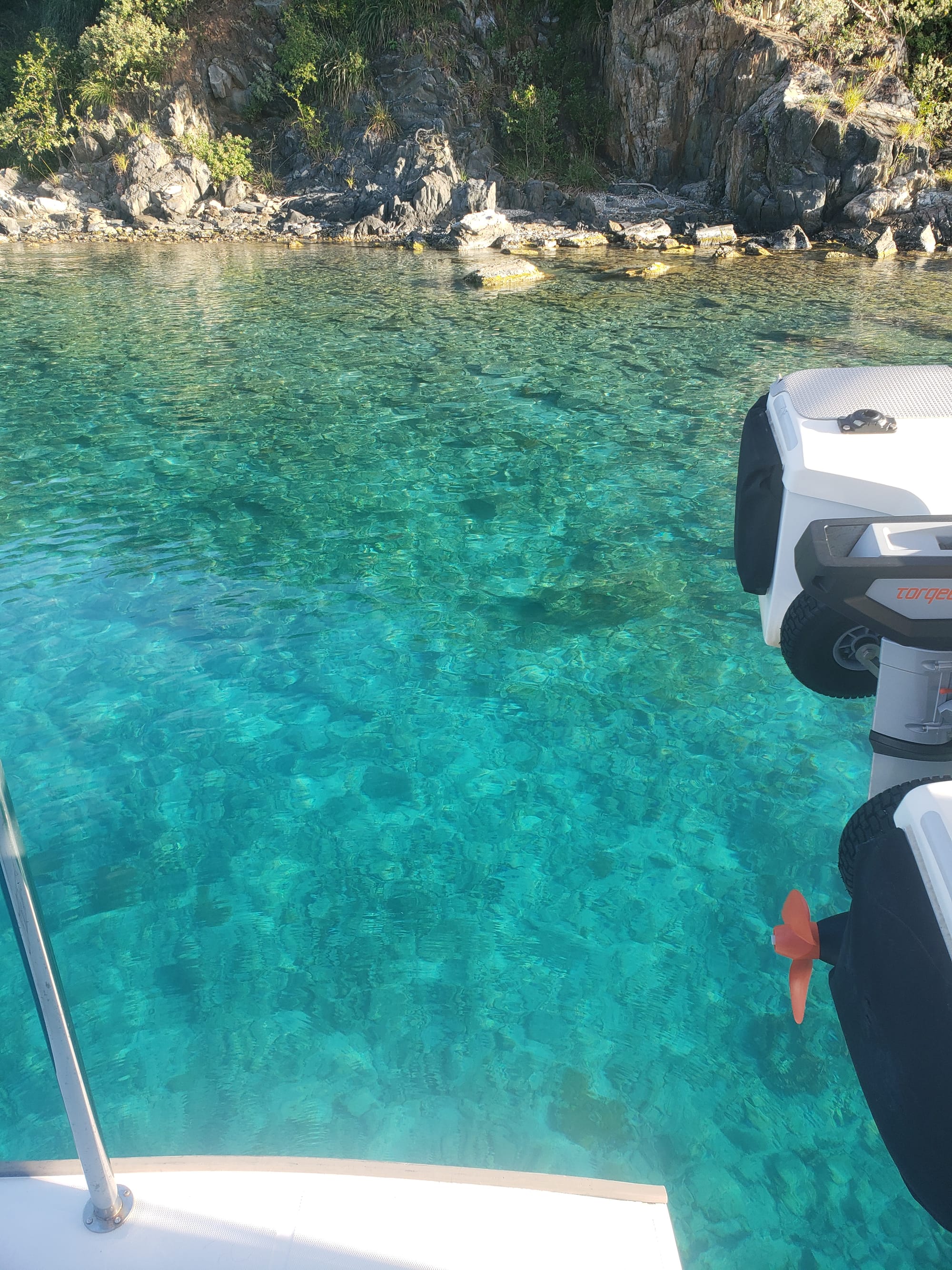 Then you drop the anchor and let out chain, all while BACKING THE BOAT TOWARD SHORE AND ROCKS. It's utterly insane. Then, once the anchor is set and bridle attached (please please please don't let the anchor drag and send us into the rocks), you swim to shore with a giant strap and some floating line, attaching things TO THE ROCKS AND TREES WHICH YOU ARE ALREADY FAR TOO CLOSE TO but somehow are still too far away for the line to reach. It took a bit of fiddling with the lines and boat position to get it right.