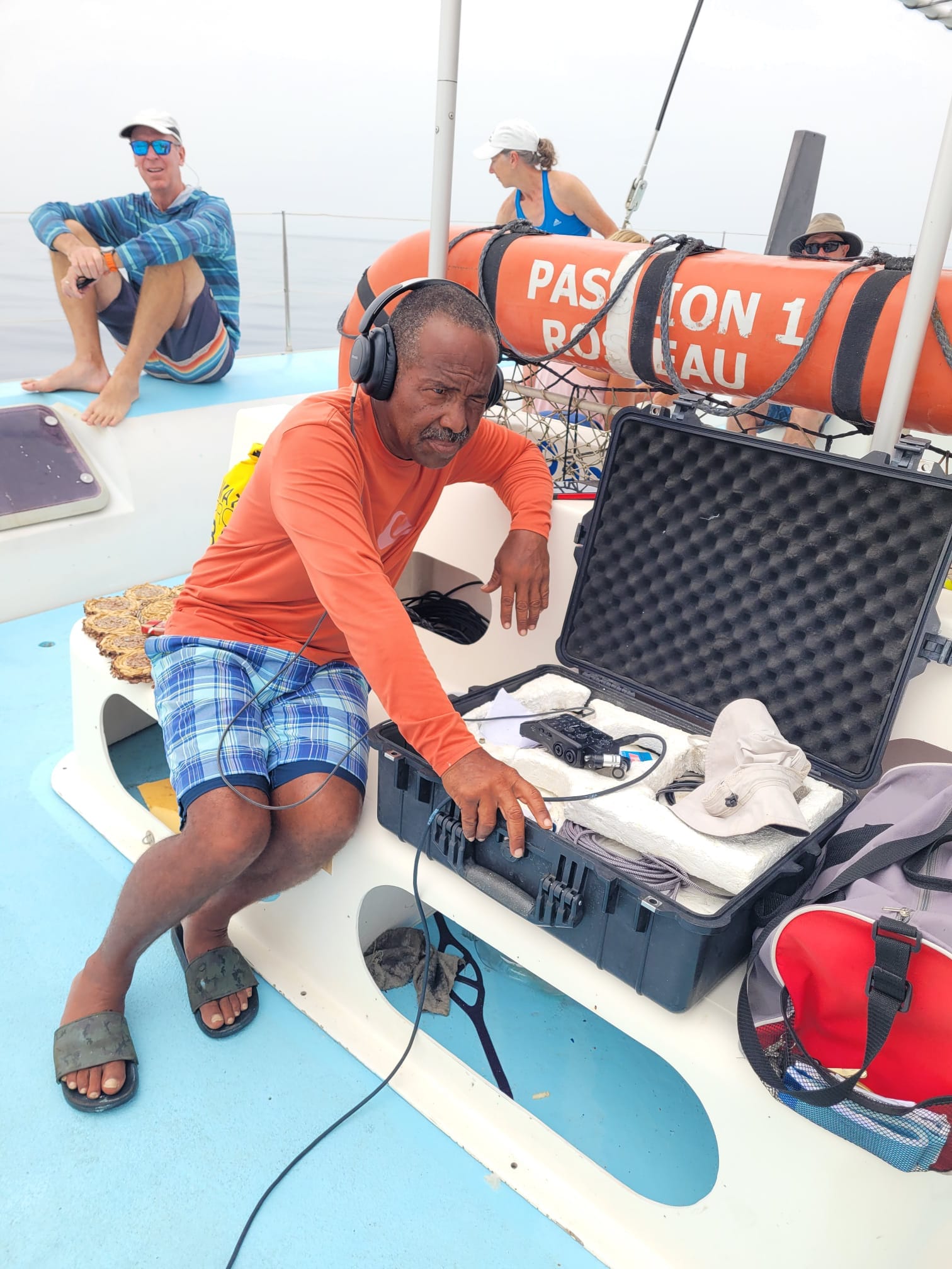 Andrew listening to the hydrophone while his deck hand (Junior) points it in different directions