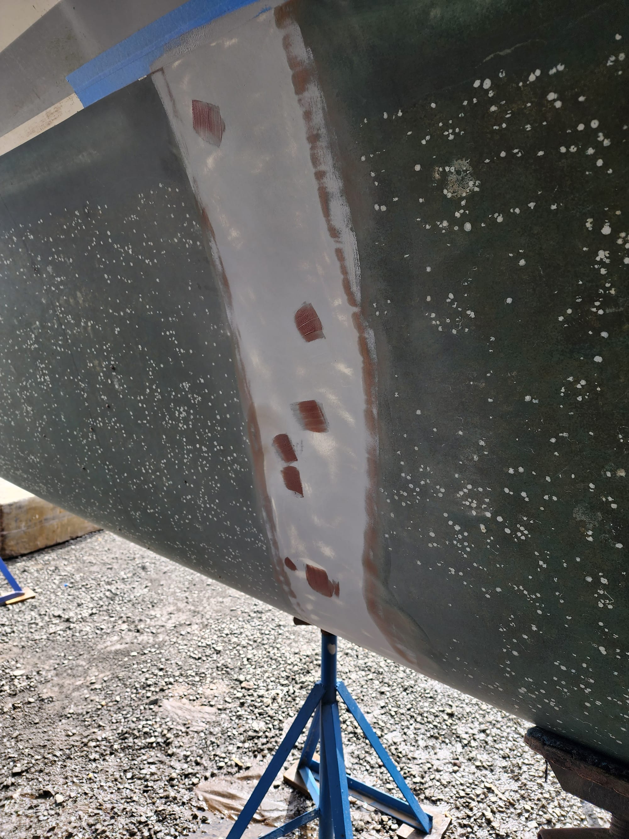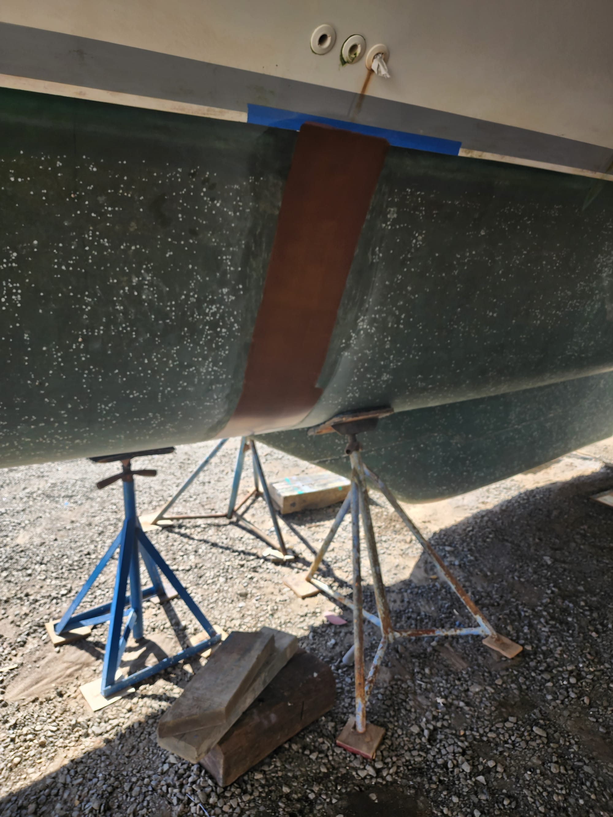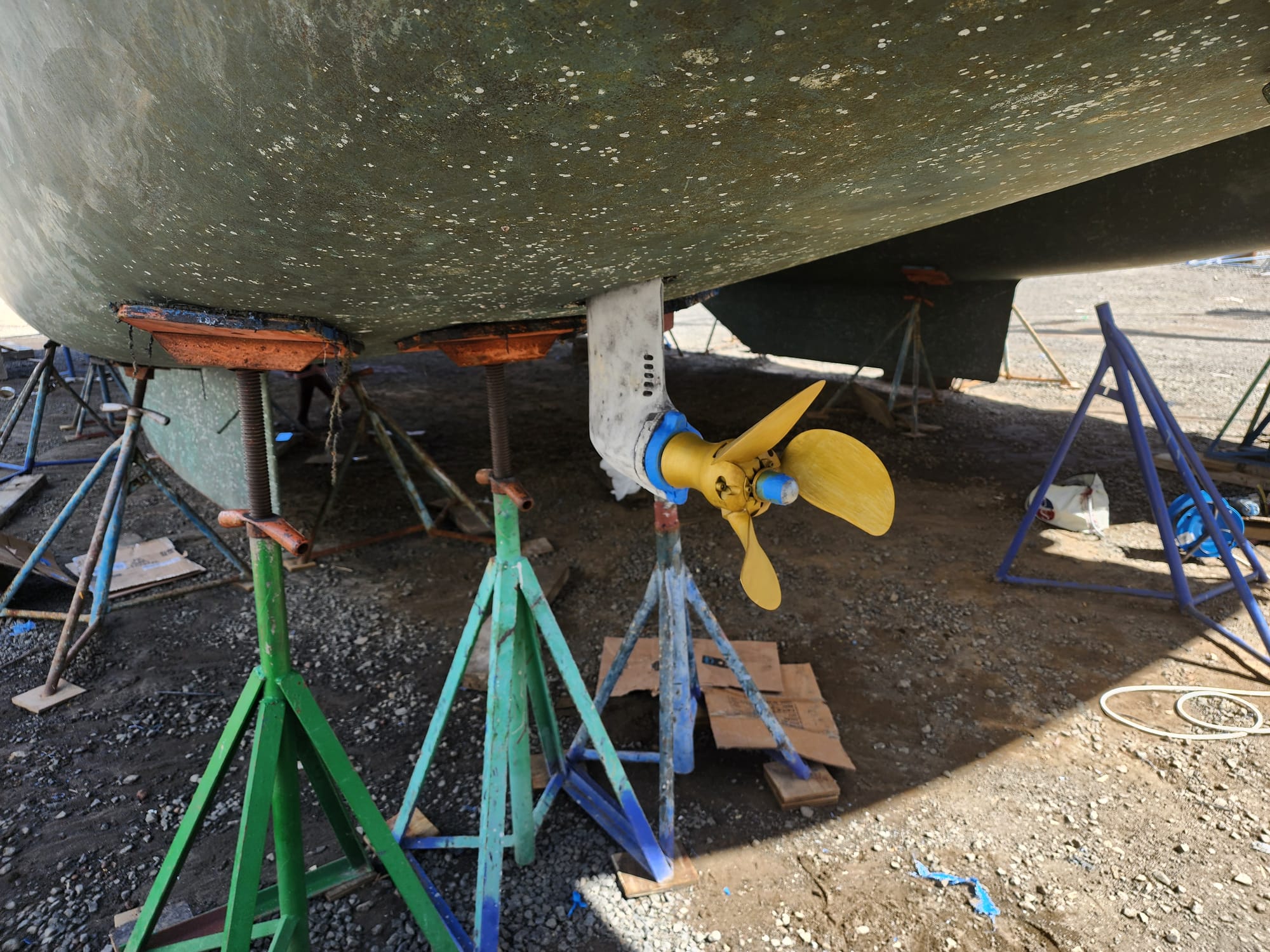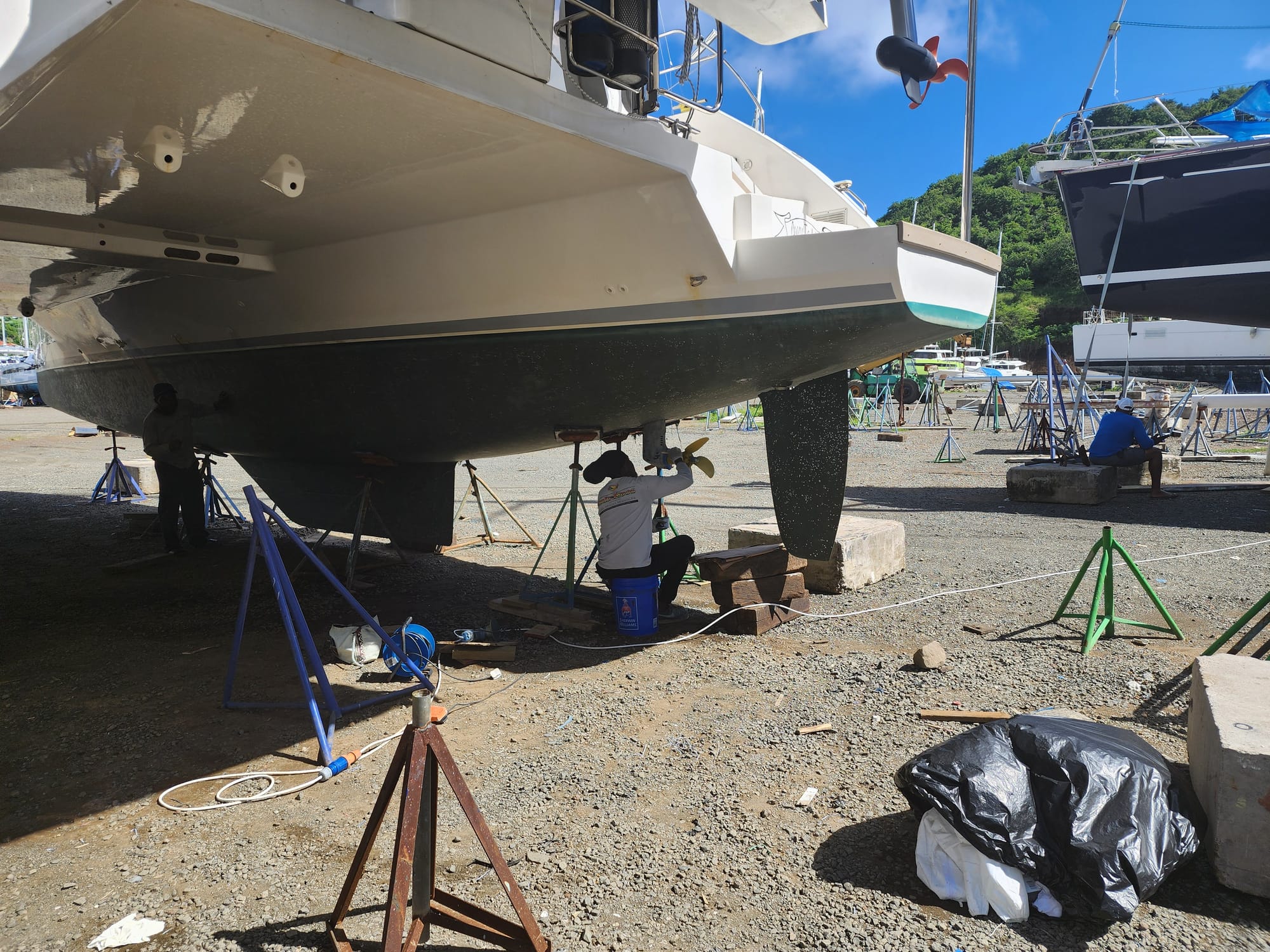 Right now, we are hauled out at Clarke's Court. The touch-up work on the coppercoat bottom paint is nearly complete, and they are applying antifouling paint to the saildrives and propellers.