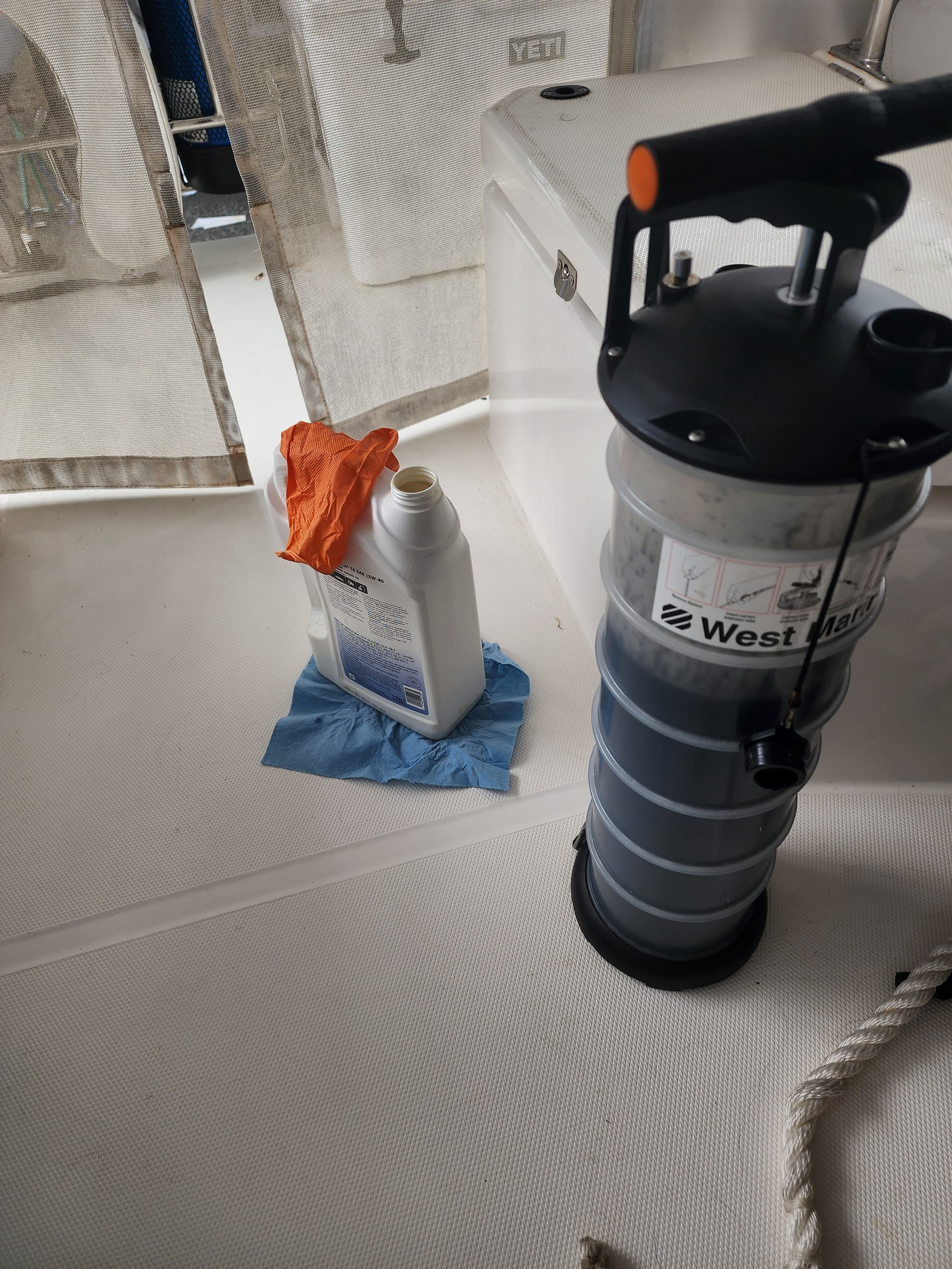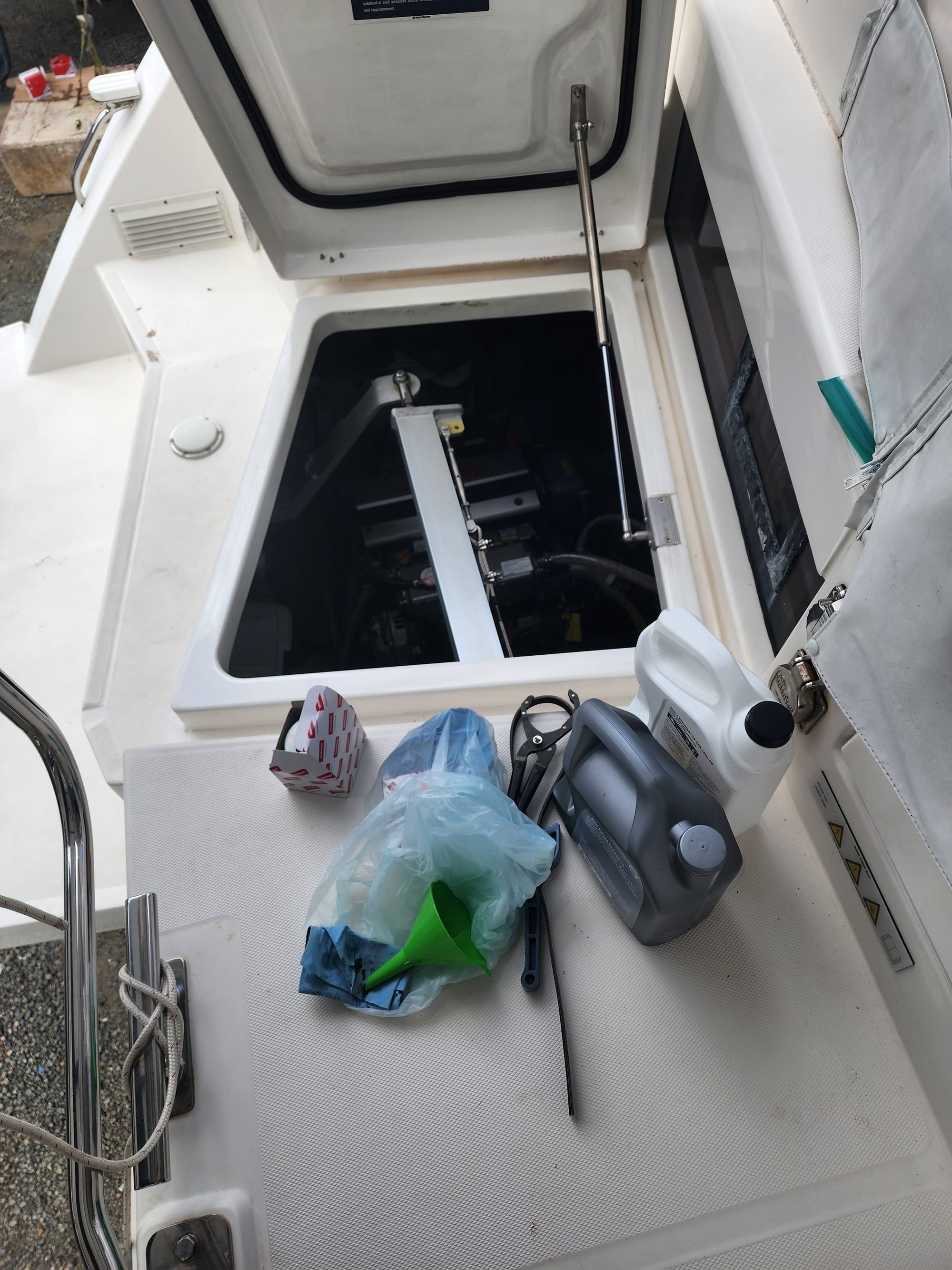 I have replaced the lower saildrive seals, changed the oil in the engines and saildrives, and I replaced the oil filters for the engines. The zinc anodes have been replaced, too. I'm also starting to make a new anchor bridle (Trinidad was hard on the old one, it's covered in barnacles). Everything is refreshed for the new owners.